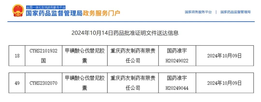 2024年10月14日,国家药品监督管理局官网显示,药友制药的甲磺酸仑伐替尼胶囊(4mg、10mg)获批上市并视同过评。